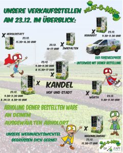 Wenn Sie über die Weihnachtstage – insbesondere für Weihnachten – Feldsalat oder anderes Gemüse aus unserem Sortiment benötigen, haben Sie folgende Einkaufsmöglichkeiten: